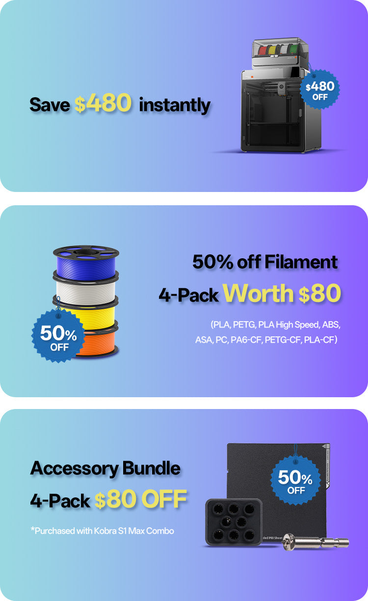 | Machine Dimension | Kobra S1 Max: 502.7mm*483mm*584mm; ACE 2 Pro: 368mm*291.5mm*236.5mm | 502.7mm*483mm*584mm | Kobra S1: 400mm*410mm*490mm; ACE Pro: 365.94mm*282.84mm*234.5mm |