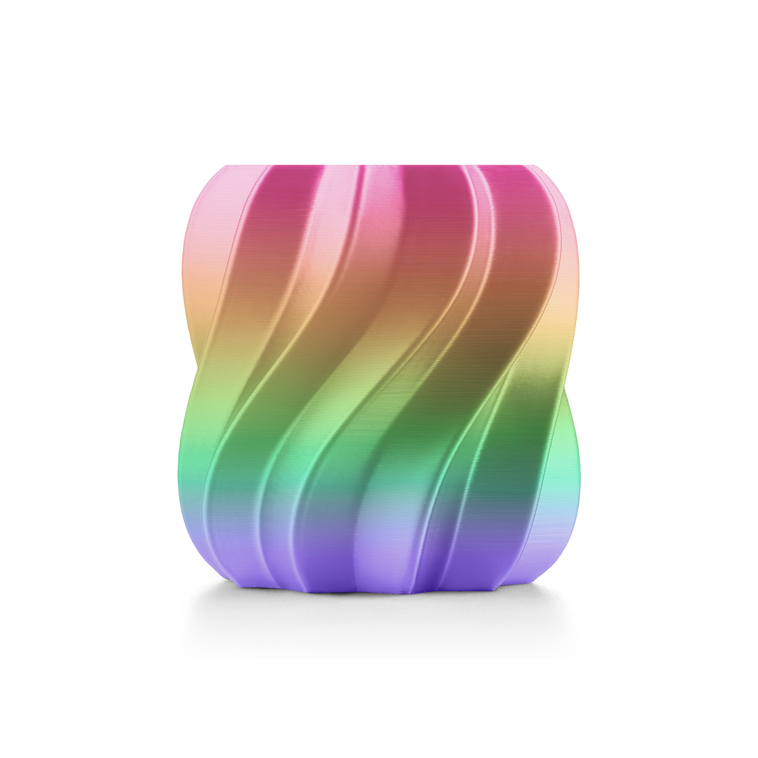 The PLA Silk Rainbow filament features a gradual multicolor effect, with a color change occurring approximately every 16 meters. This means your prints will shift through multiple vibrant hues over time, creating a beautiful gradient finish.