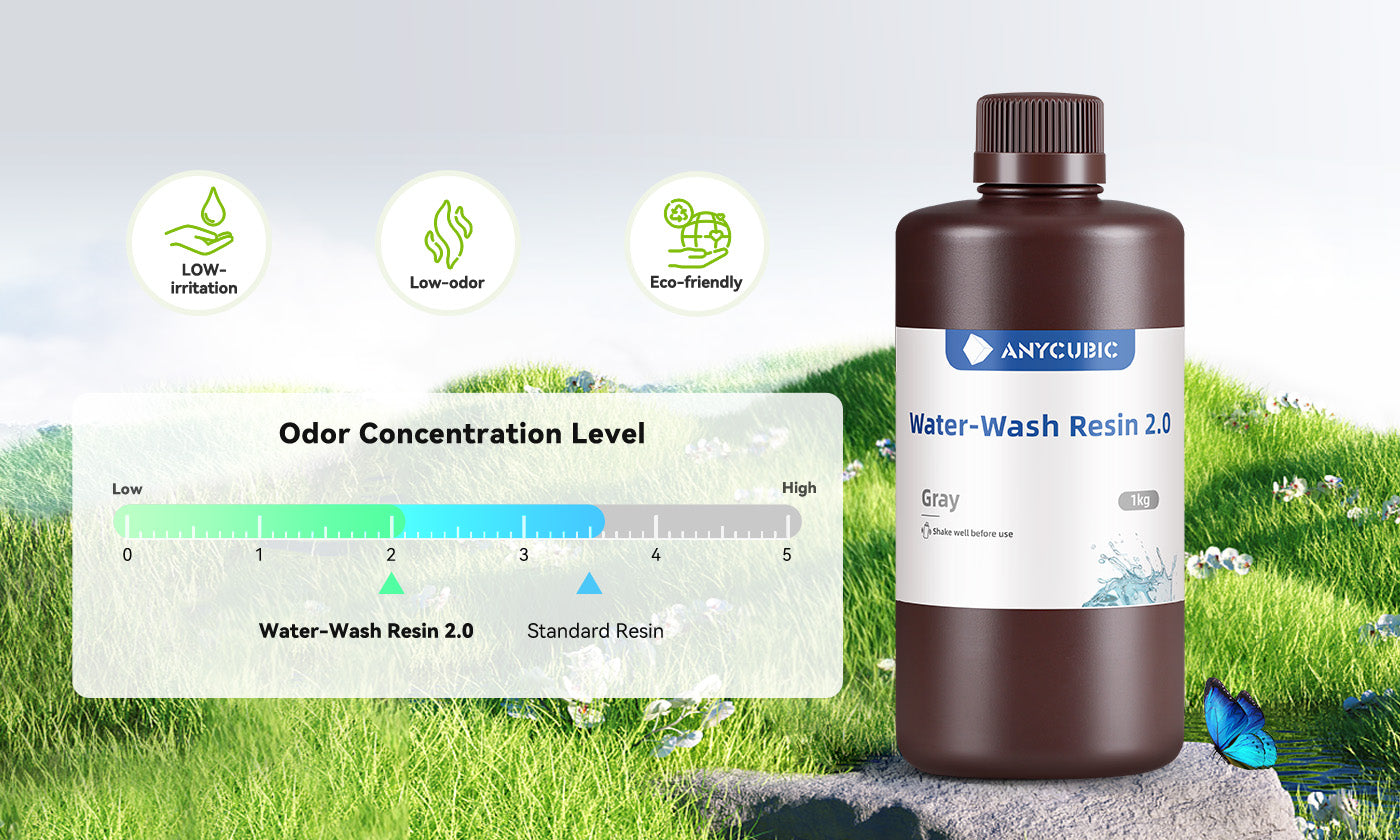 Water-Wash Resin 2.0 emits a slight odor and can be easily cleaned with water. For curing, you may want to buy a Wash & Cure Machine.